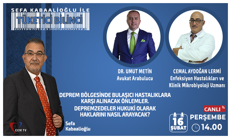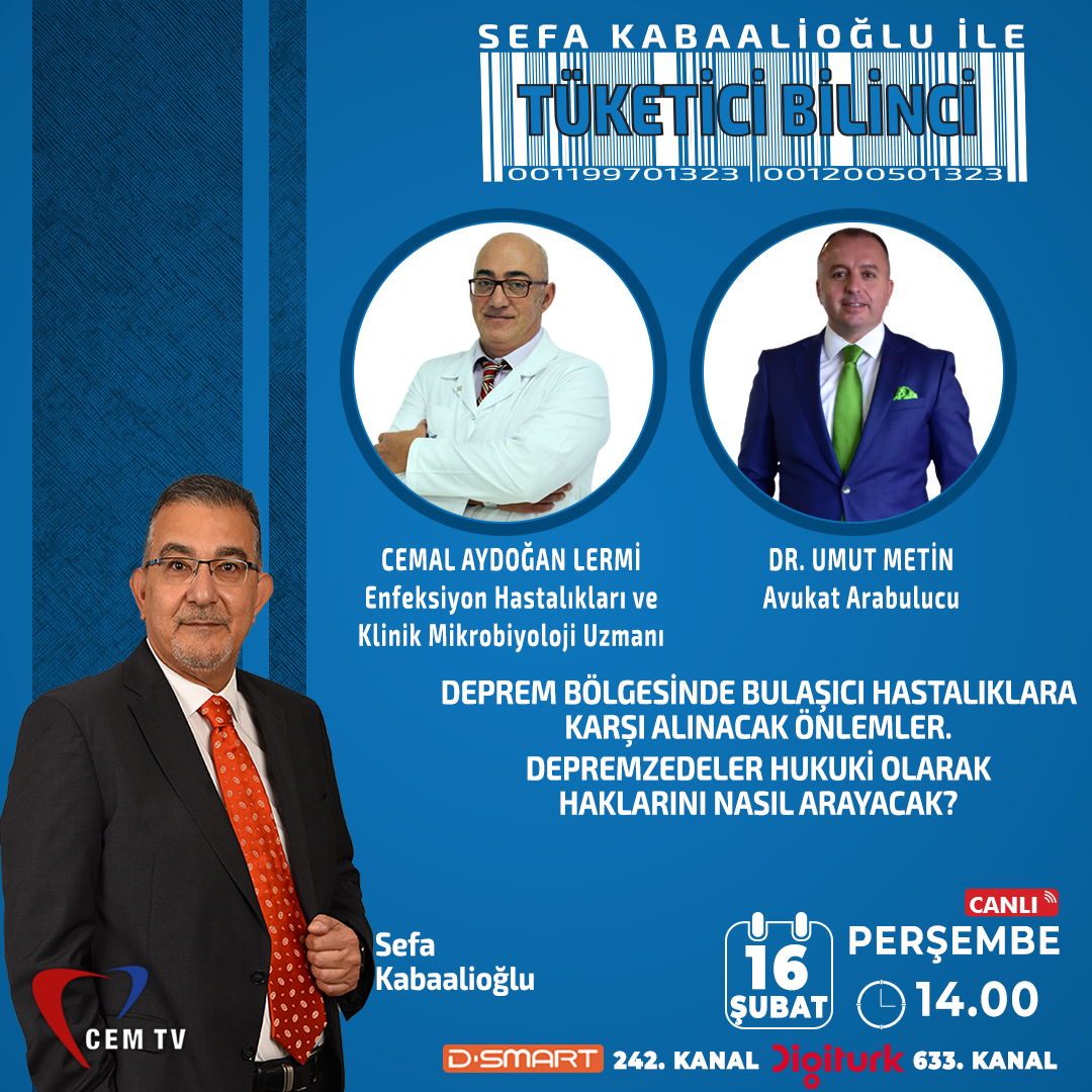 16.Şubat.2023 Perşembe günü Cem TV ekranlarında saat 14:00 – 16:30 arasında Canlı olarak yayınlanacak ” DEPREM ÖZEL ” programımıza Enfeksiyon Hastalıkları ve Klinik Mikrobiyoloji Uzmanı Doktor Cemal Aydoğan LERMİ ve Avukat Arabulucu Dr. Umut METİN konuk olacaklar.